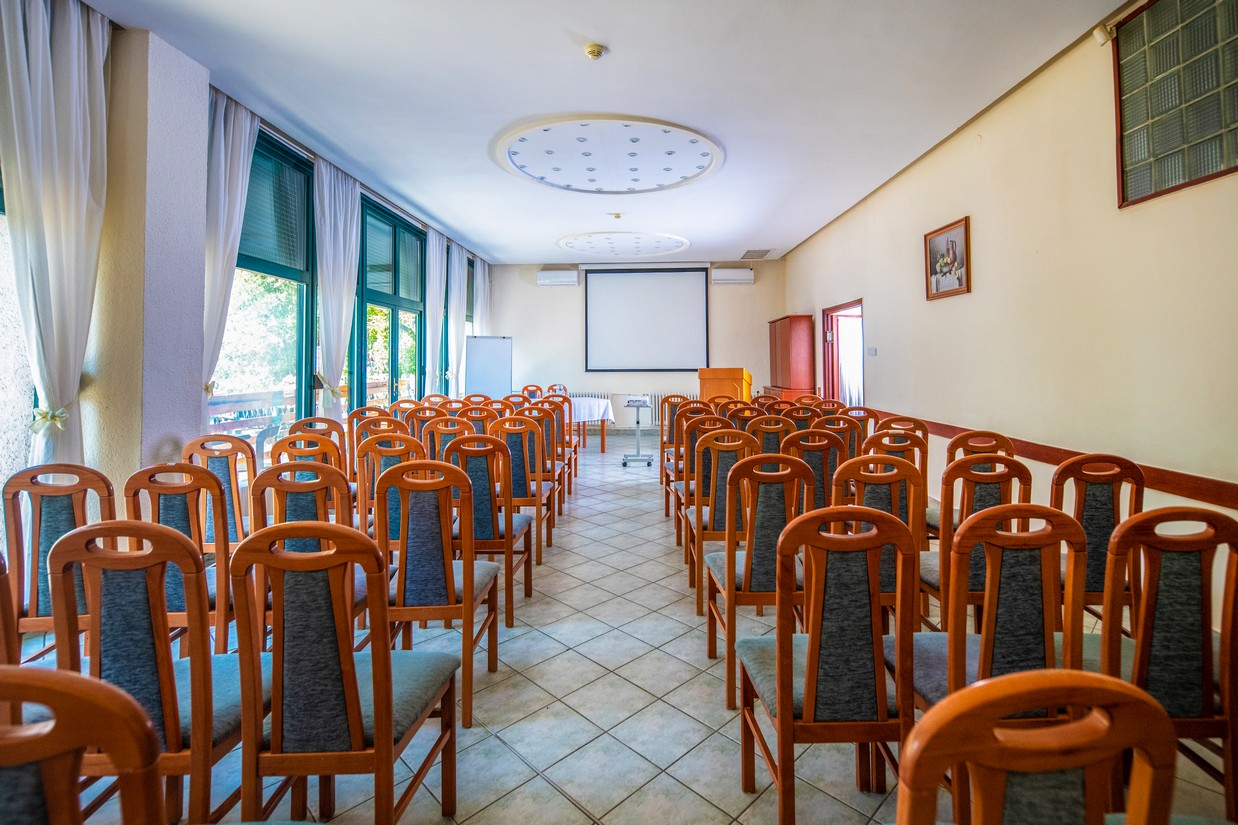 A hang- és vizuáltechnikai eszközökkel (projektor, vetítővászon, flipchart, mikrofon) felszerelt, széksoros berendezésű terem ideális konferenciák, szimpóziumok, továbbképzések lebonyolítására.